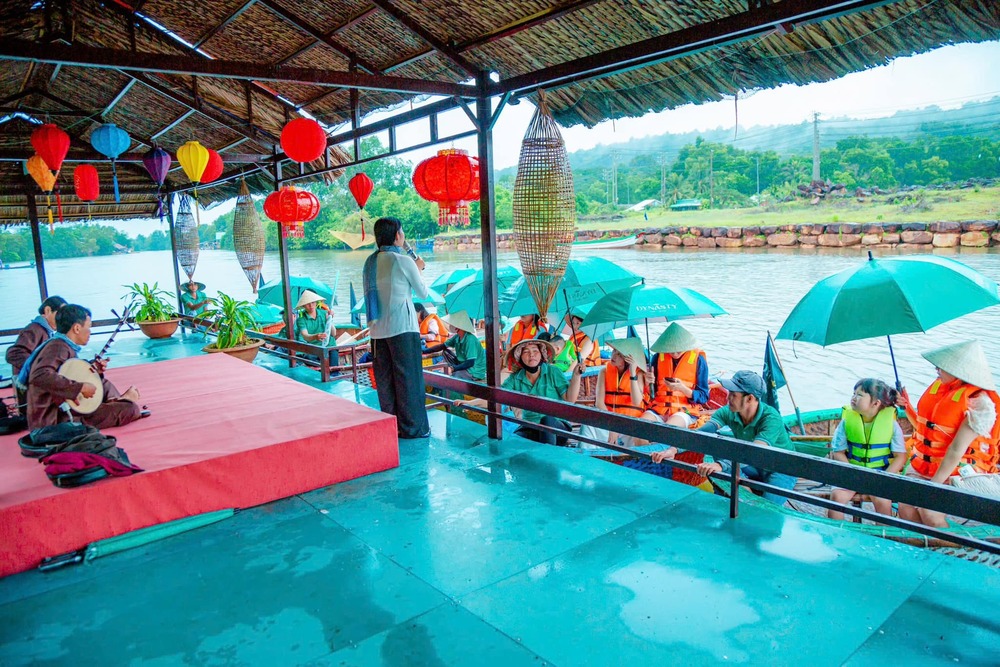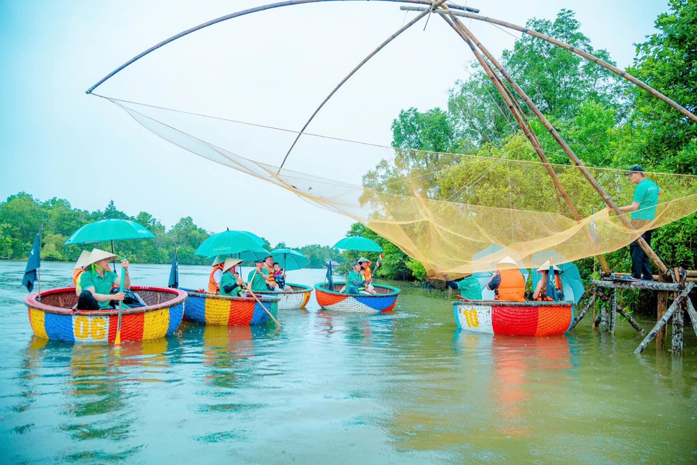 Hành trình tiếp tục bằng trải nghiệm chèo thuyền thúng trên sông Cửa Cạn, len lỏi qua rừng ngập mặn xanh mướt, cảm nhận không gian mộc mạc và khám phá đời sống của người dân địa phương. Tour đi kèm với bữa trưa hấp dẫn và đa dạng sẽ giúp bạn nạp lại năng lượng, sẵn sàng tận hưởng trọn vẹn chuyến đi.